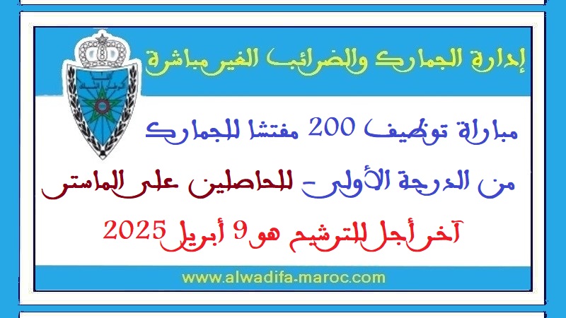 وزارة الاقتصاد والمالية: مباراة توظيف 200 مفتشا للجمارك من الدرجة الأولى - للحاصلين على الماستر. آخر أجل للترشيح هو 9 أبريل 2025