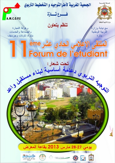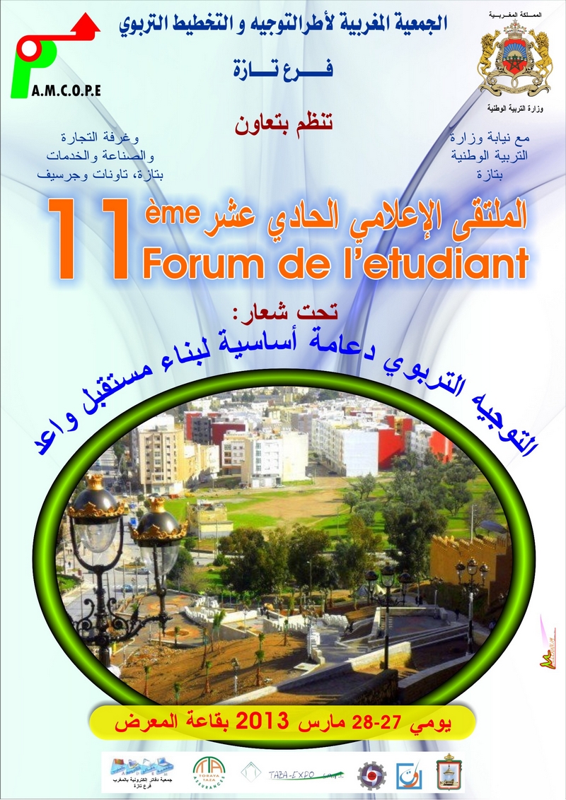 في إطار تنفيذ برنامج أنشطتها السنوي ،كما دأبت على ذلك كل سنة ،بهدف تحقيق مبدأ تكافؤ الفرص في الحصول على المعلومات المتعلقة بالآفاق الدراسية والجامعية والمهنية تنظم الجمعية المغربية لأطر التوجيه والتخطيط التربوي ،فرع تازة ، ملتقى الإعلام المدرسي والجامعي والمهني الحادي عشر تحت شعار " التوجيه التربوي دعامة أساسية لبناء مستقبل واعد "وذلك يومي 27و28 مارس بقاعة المعرض بتازة. وبهذه المناسبة تتشرف الجمعية بدعوة التلاميذ والطلبة والآباء والأولياء وكل زملائنا أطر التوجيه والتخطيط التربوي لحضور هذا الملتقى لما يكتسيه من أهمية في بناء مستقبل ناشئتنا.